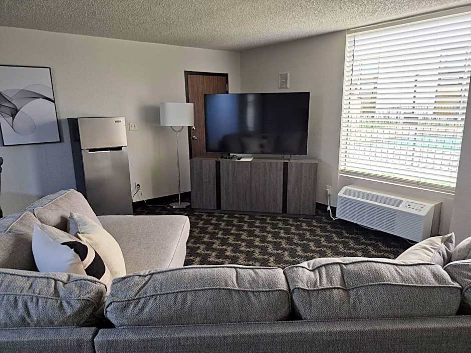 Offers a flat-screen cable TV, microwave, and fridge.
