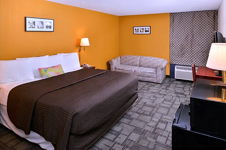 Features a flat-screen cable TV, microwave, and fridge.